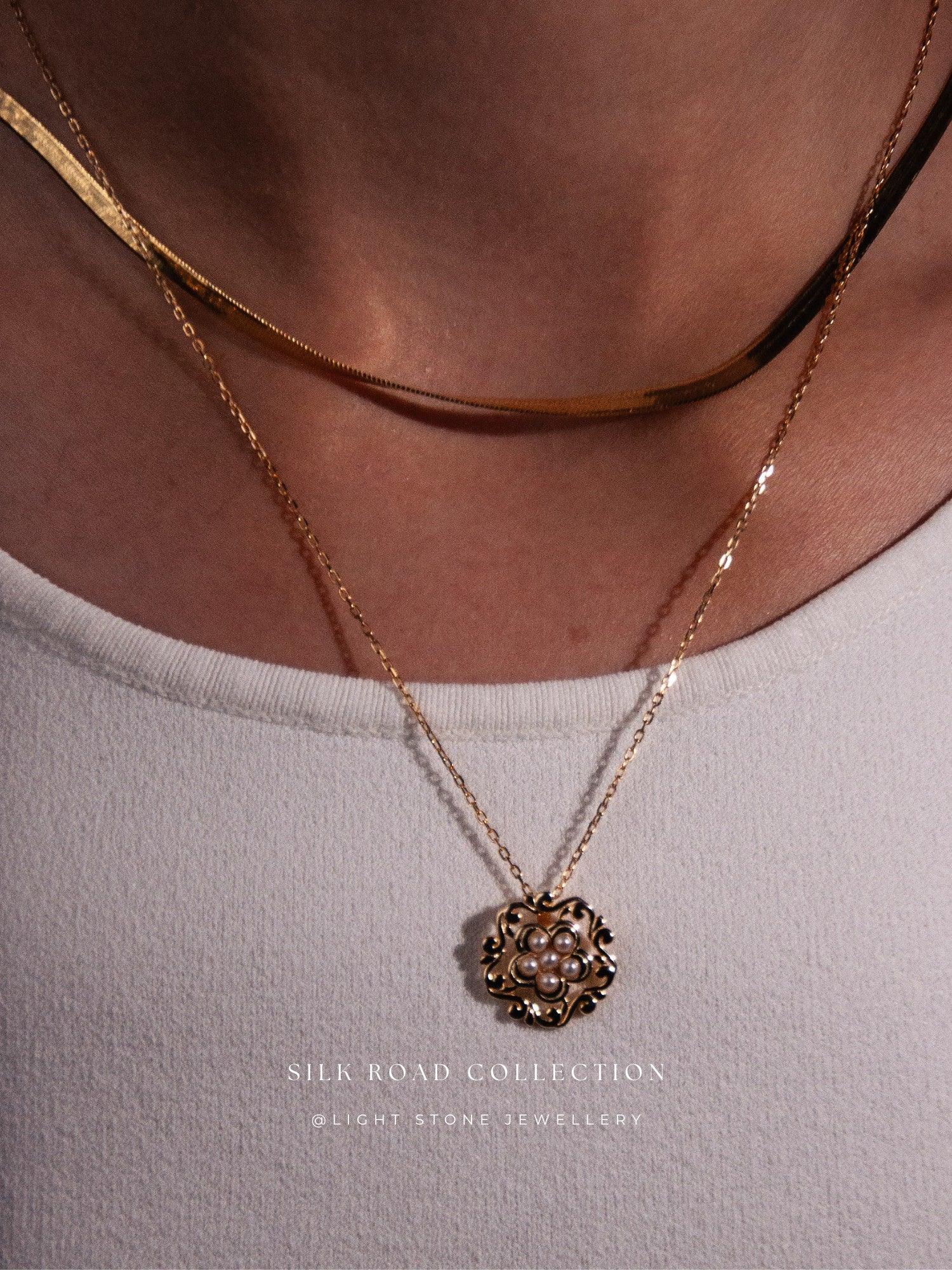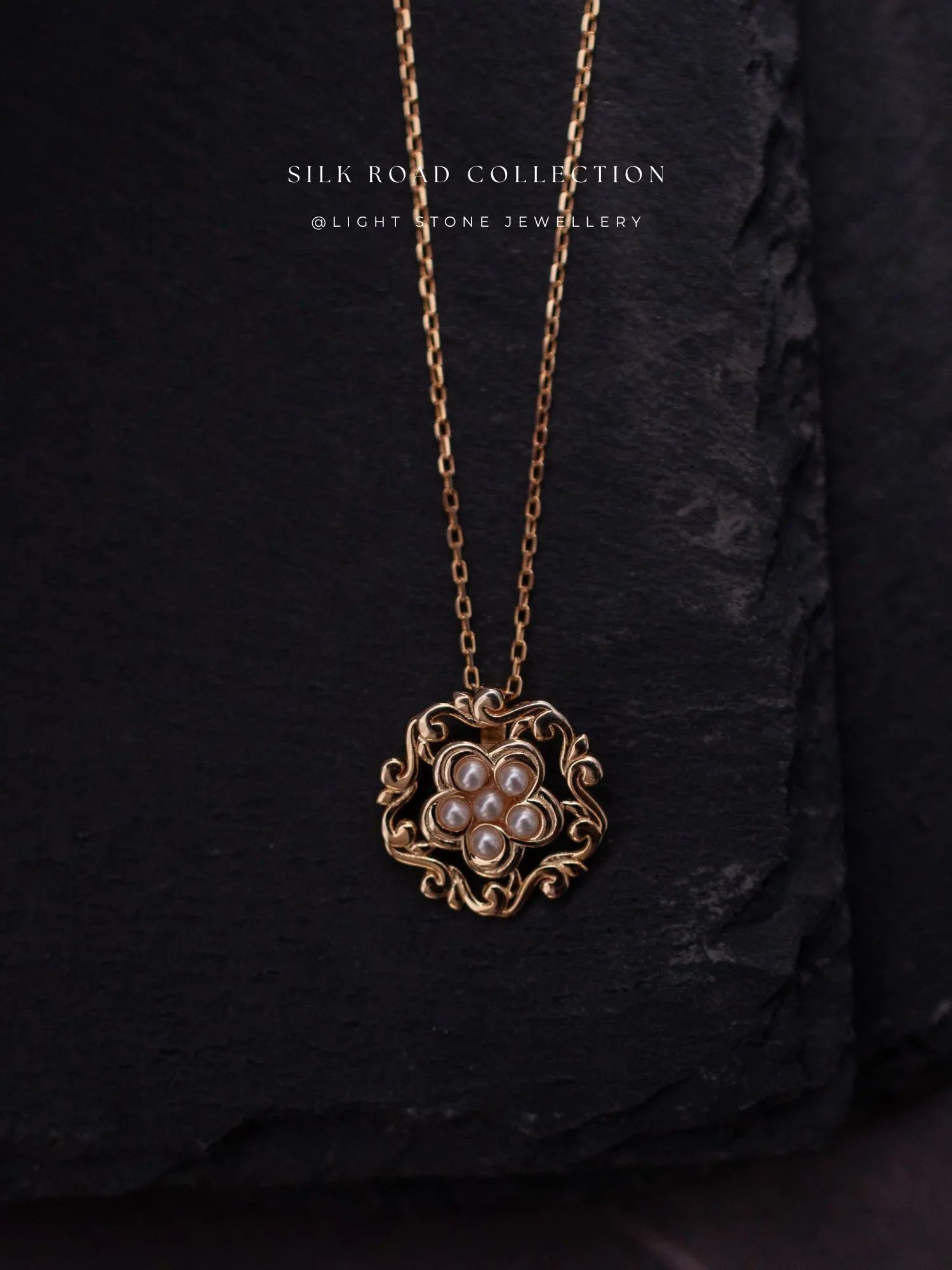 This is a necklace inspired by the honeysuckle motifs found in Dunhuang culture—symbols of resilience and elegance, known for blooming in even the harshest environments.