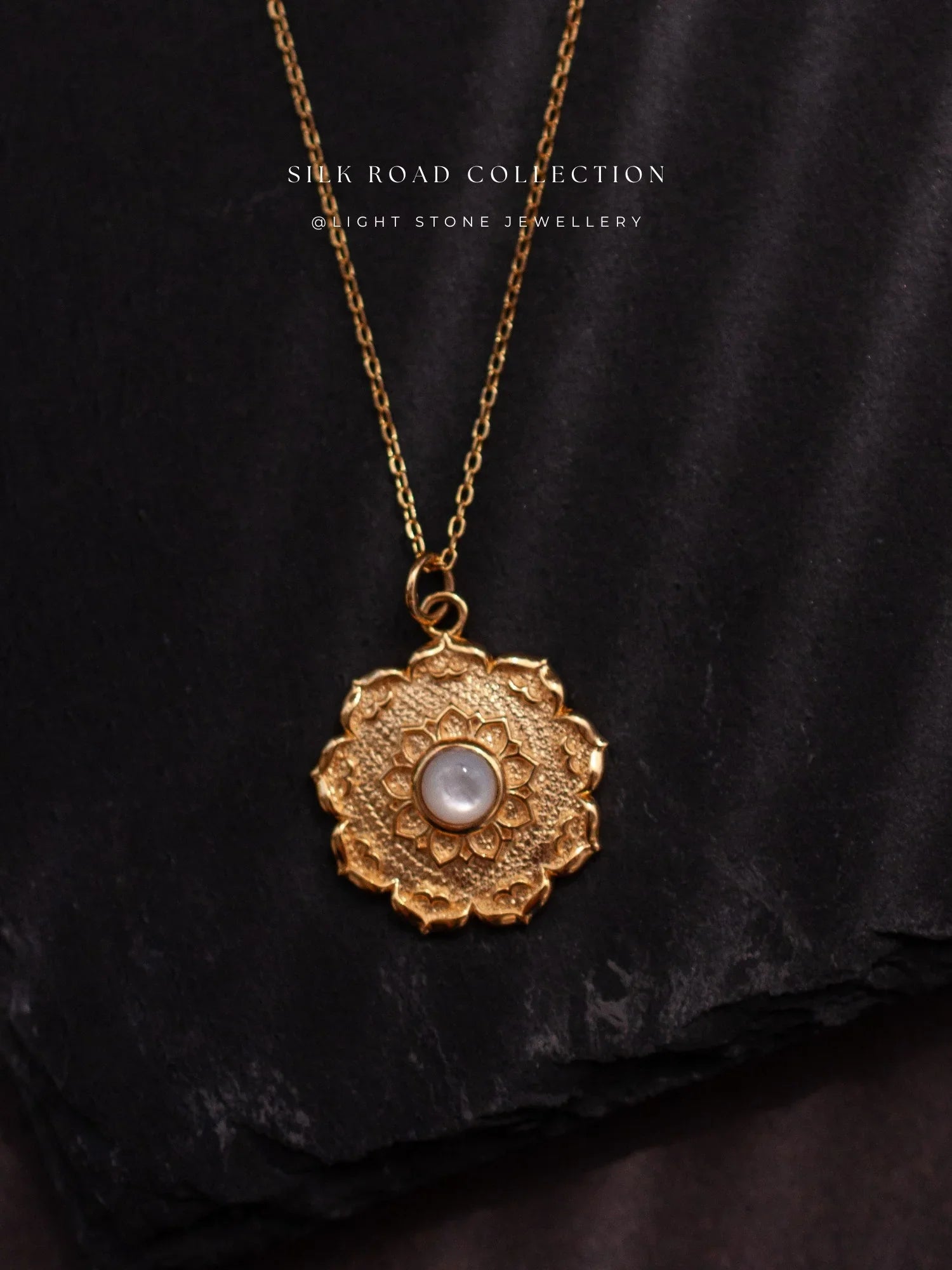 Inspired by mural ornamentation along the Silk Road, this necklace condenses the lotus form into a pendant of delicate proportion—poised just above the collarbone.