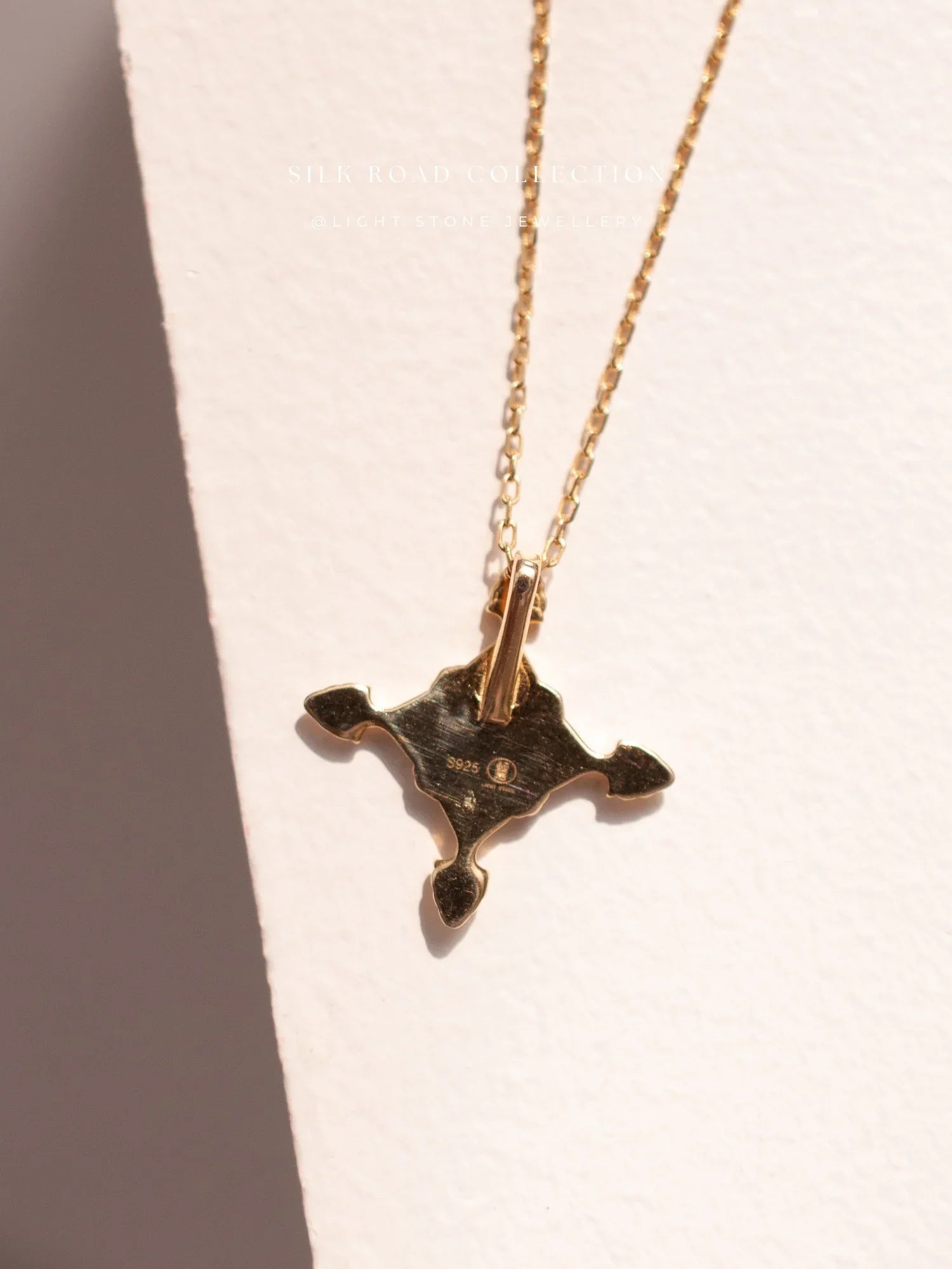 The pendant is cast in gold-plated 925 silver and filled with white enamel. Each quadrant is outlined by clean curves, terminating in pointed tips—a form both architectural and ornamental.