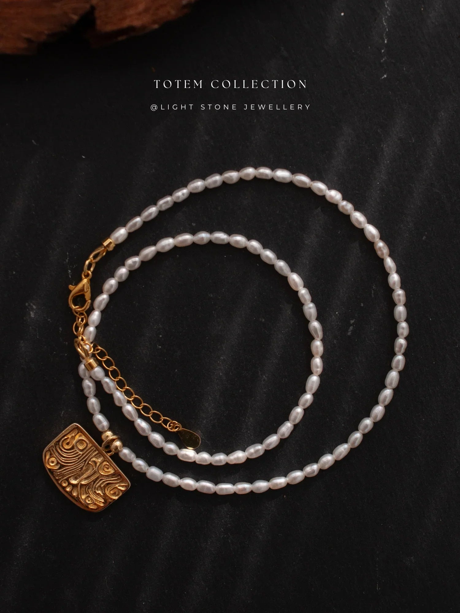 Suspended from a strand of uniform seed pearls, the rectangular pendant is marked by a surface of brushed lines—interlaced and feathered, folded into a contained plane.