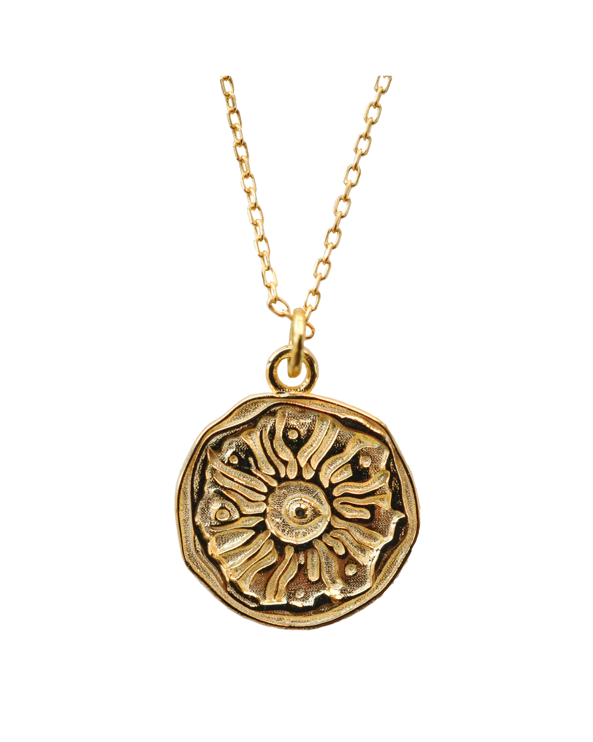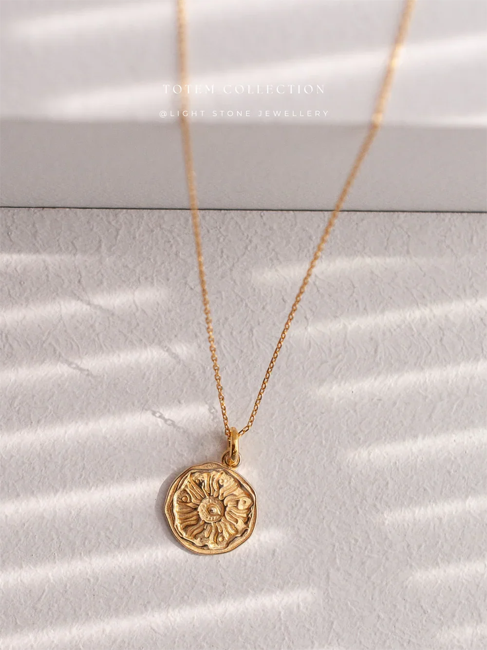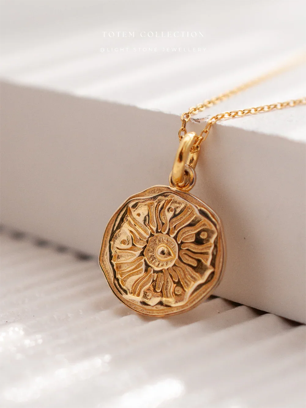The pendant is cast in gold-plated 925 silver, with finely embossed detailing that catches light from multiple angles. The result is a surface that feels dimensional yet quiet—balanced between ornament and control.
