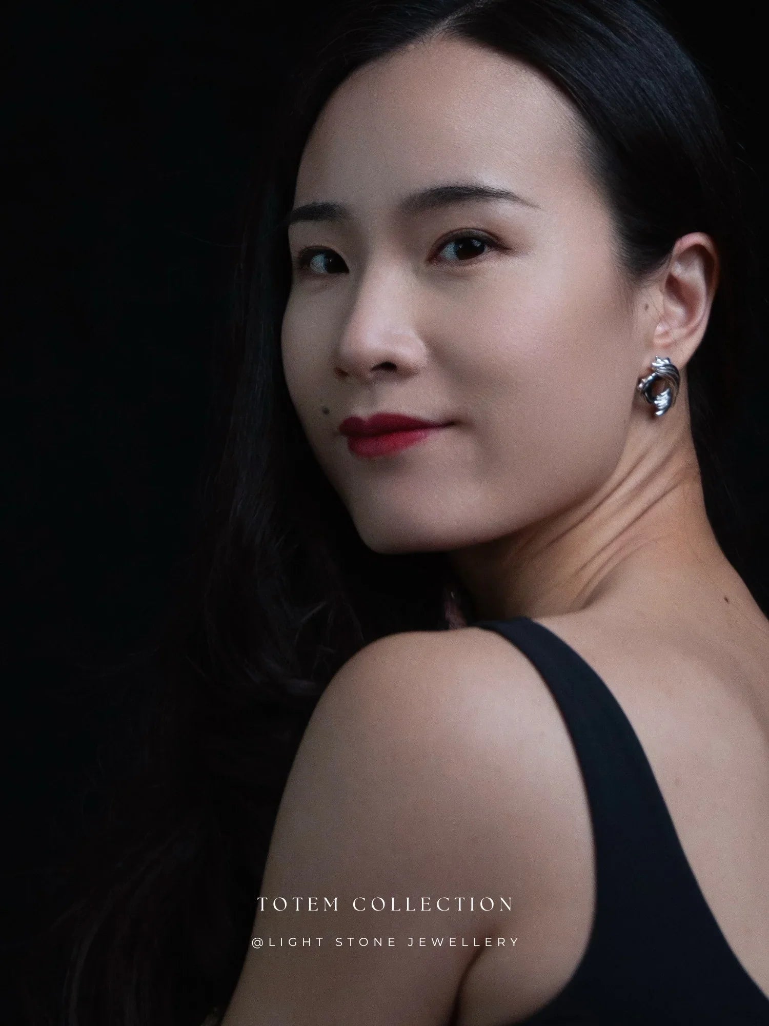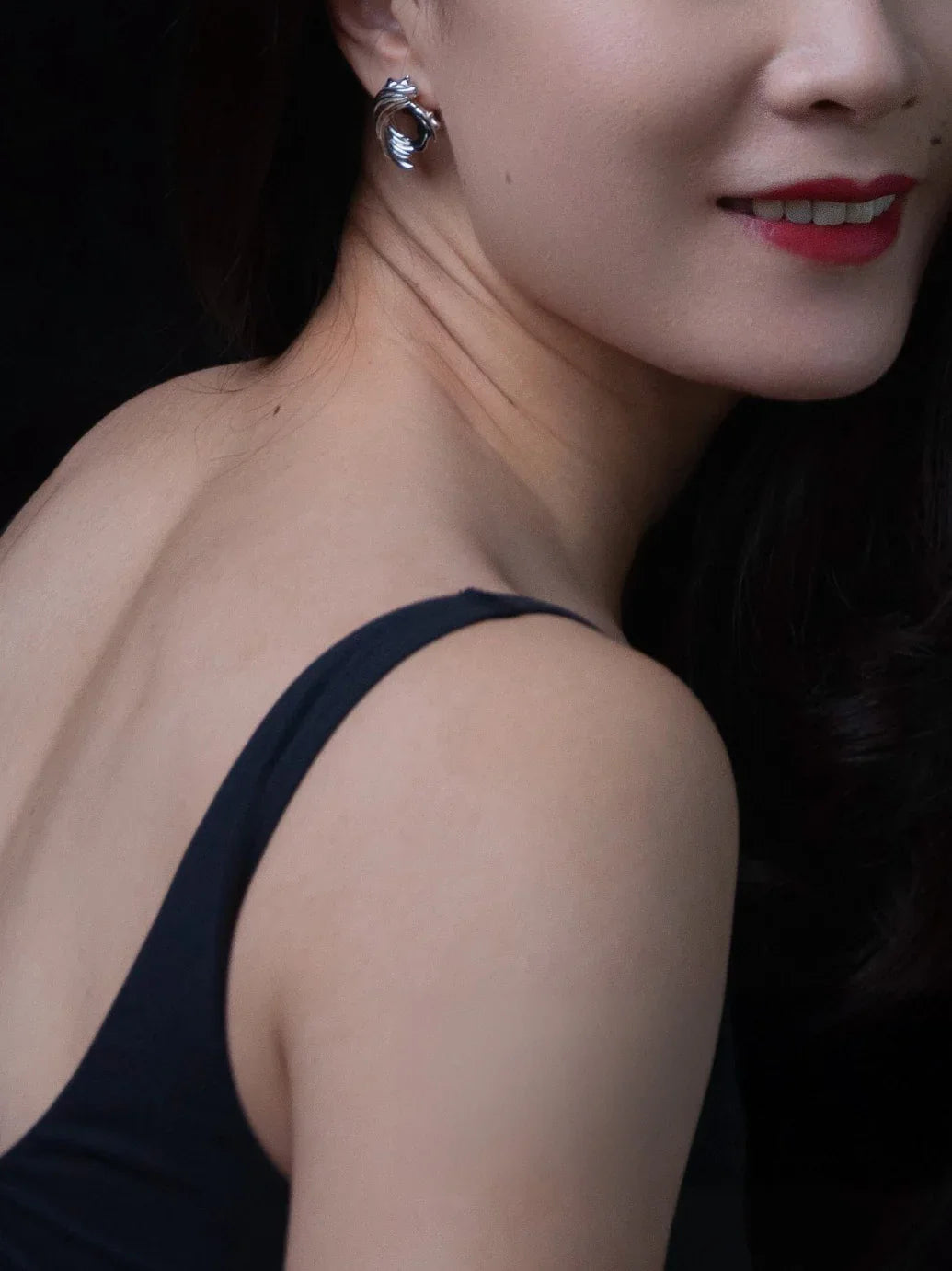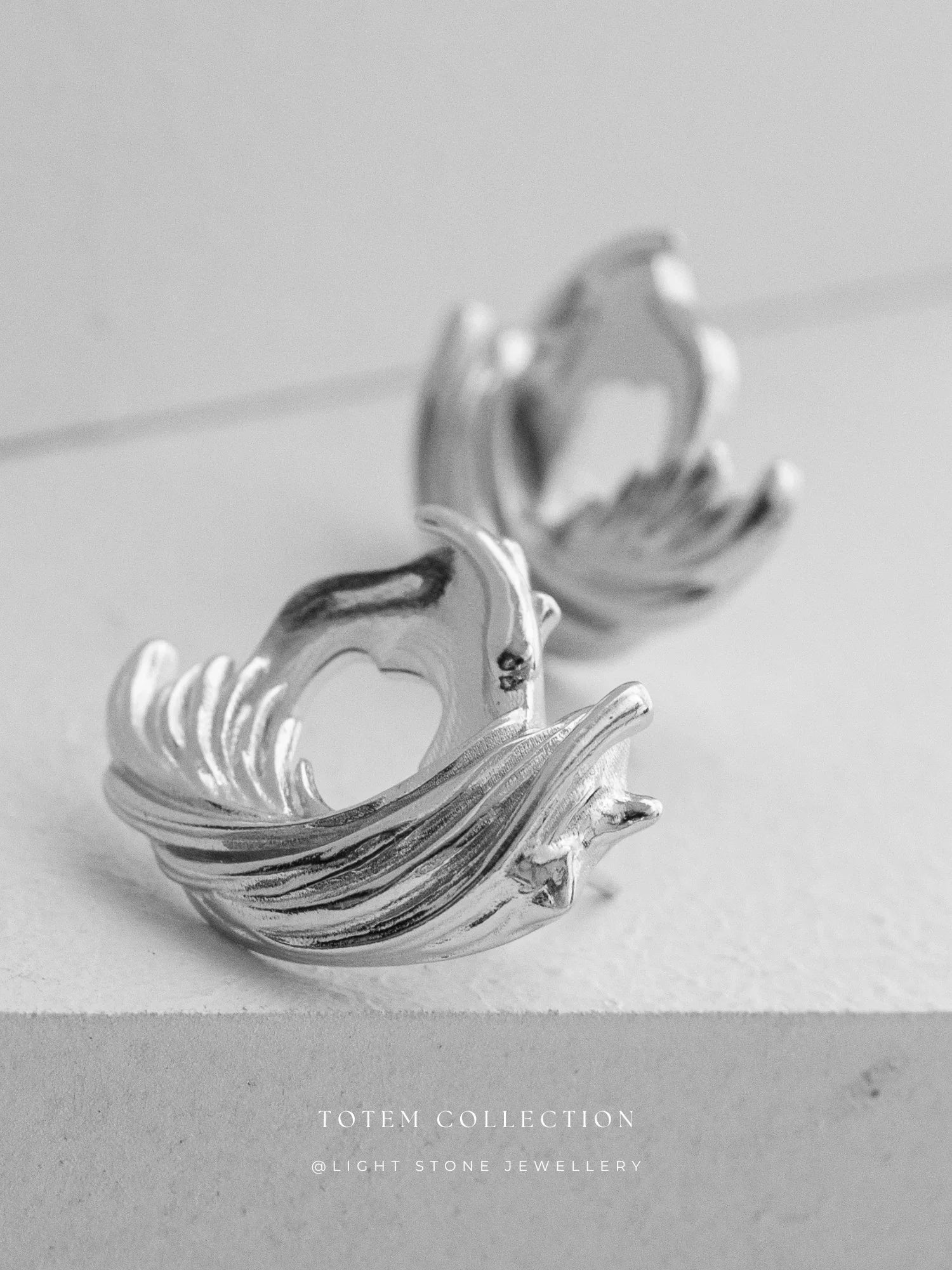 This pair of ear studs reinterprets phoenix feather forms through a cool-toned lens—curved lines drawn upward in tight spirals, creating a clear sense of motion within a stable frame.