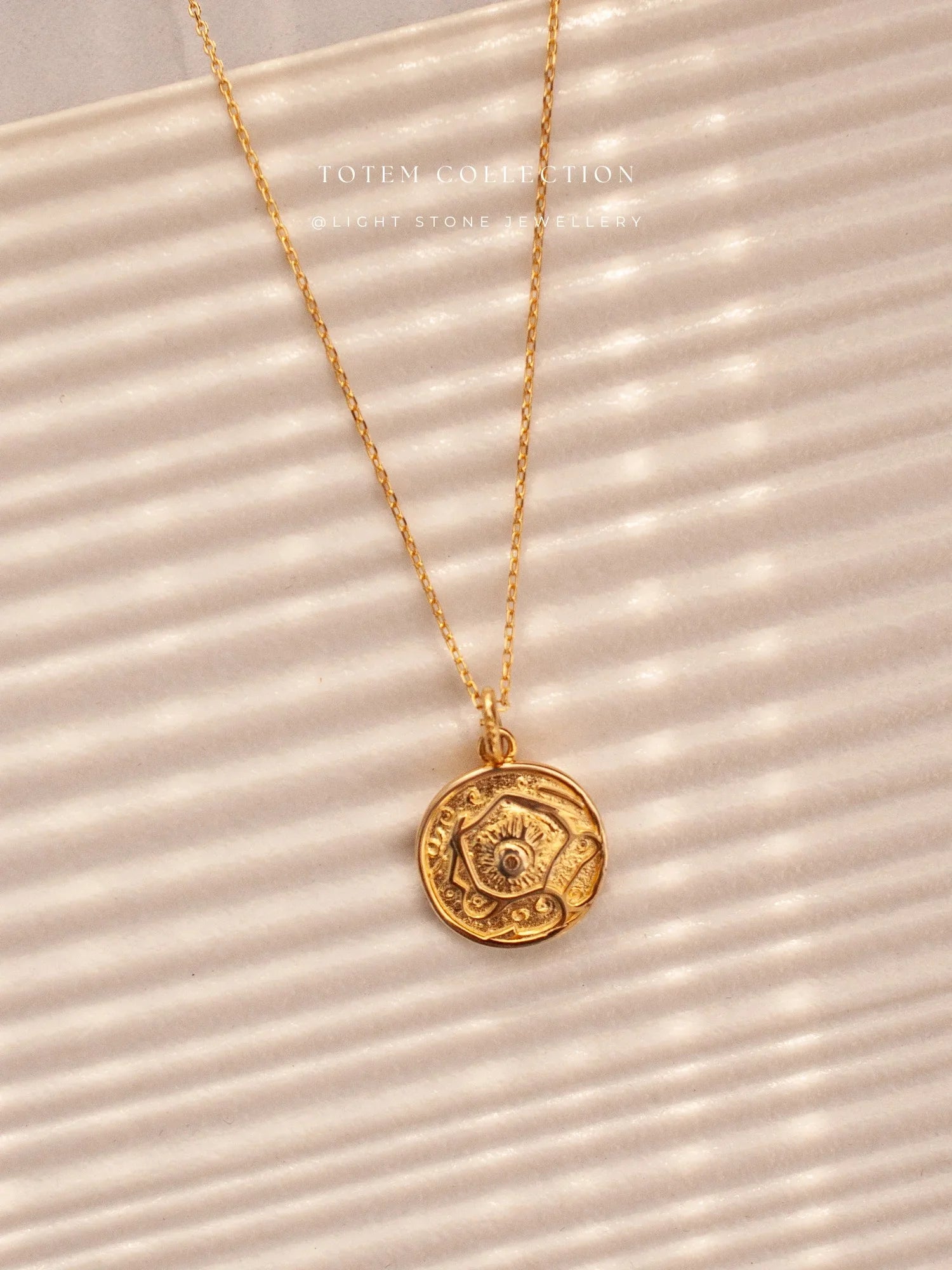 Inspired by circular forms on Neolithic pottery, this pendant restructures ancient motifs into a tight visual grid—repetition without excess, logic without rigidity.