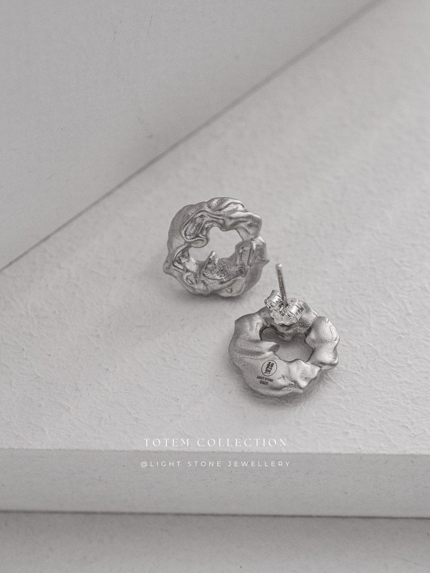 The rhodium-plated 925 silver surface is defined by a contrast of soft arcs and sharp edges. Its cool finish sharpens the visual edges, while preserving the clarity of the lines.