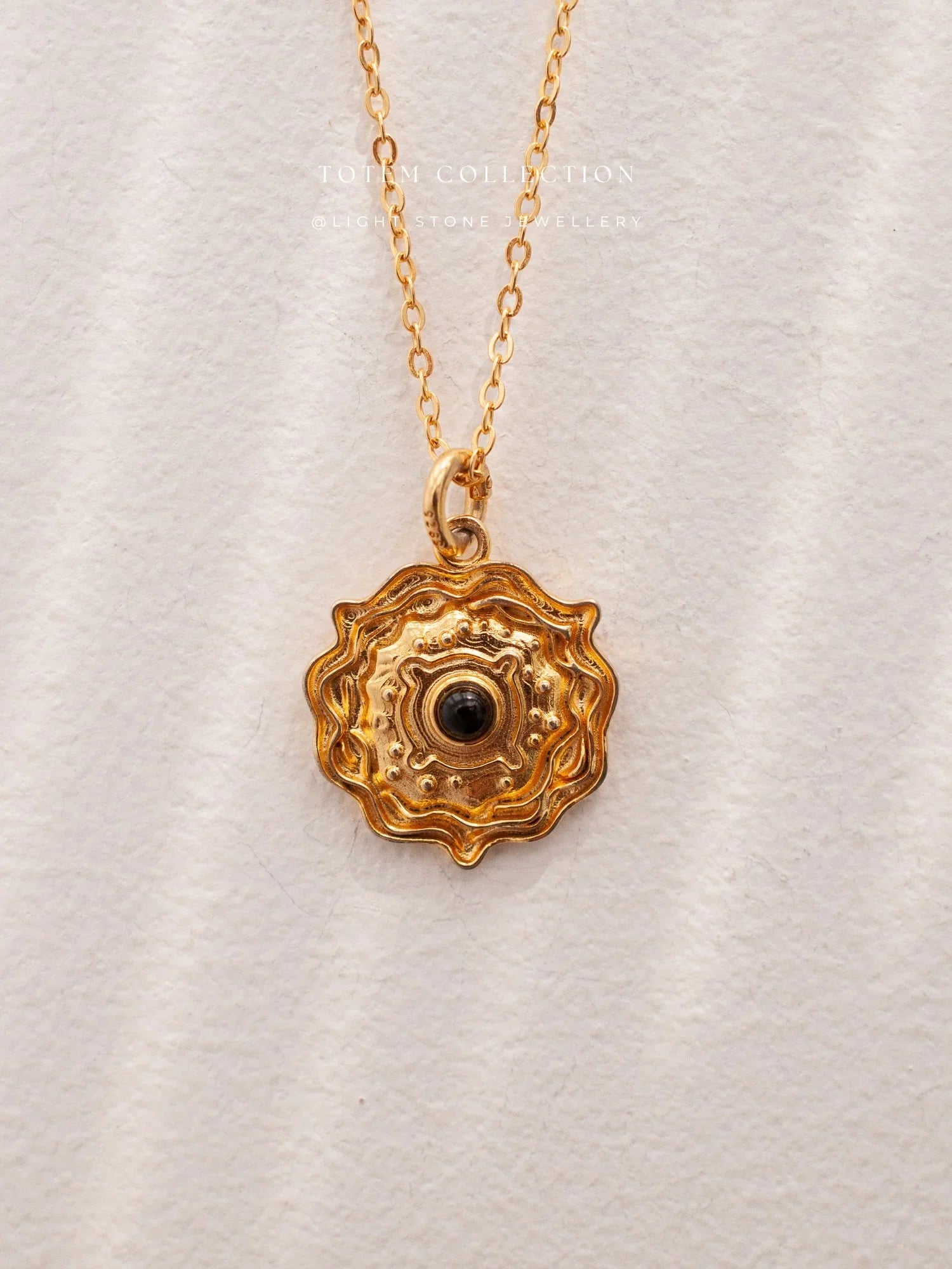 The form is executed in gold-plated 925 sterling silver, its surface ringed with embossed bands that echo coiled clay. In the center sits a disk of polished black onyx—matte, opaque, resolute.